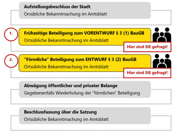 Zur Erarbeitung der oben genannten Bauleitpläne sieht die Gesetzgebung vor, dass die „Öffentlichkeit“ sowie die „Behörden und sonstigen Träger öffentlicher Belange“ im Rahmen der Bauleitplanung einzubeziehen sind (§ 3 und § 4 BauGB) und die öffentlichen und privaten Belange gegeneinander und untereinander gerecht abzuwägen sind (§ 1 Absatz 7 BauGB).