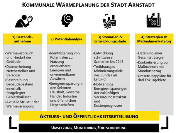 Die Erstaufstellung der Arnstädter kommunalen Wärmeplanung wird im Erarbeitungsprozess insgesamt vier Planungsphasen: