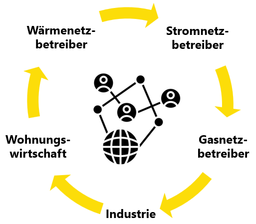 Während der oben genannten vier Planungsphasen zur Erarbeitung der kommunalen Wärmeplanung werden alle betroffenen Verwaltungseinheiten und potentiell relevanten Akteure (Energieversorger, Energieproduzenten, Netzbetreiber, Wohnungswirtschaft, Unternehmen, etc.) beteiligt (vgl. Grafik). Dieser Prozess wird von der Stadtverwaltung und einem beauftragten Planungsbüro fachlich begleitet und gesteuert.